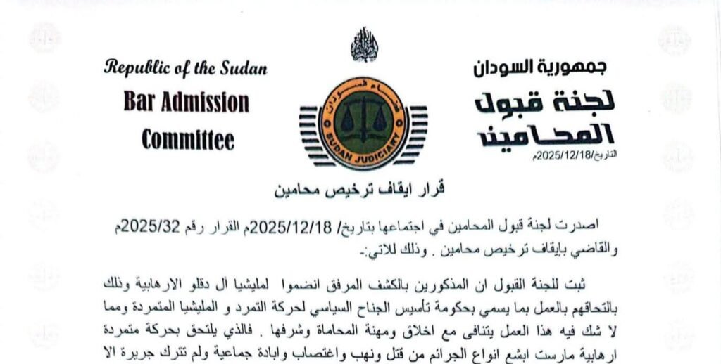 ​أصدرت لجنة قبول المحامين التابعة لنقابة المحامين السودانيين قراراً قضى بإيقاف تراخيص (31) محامياً، من بينهم أسماء بارزة مثل طه عثمان وحنان حسن، وذلك على خلفية اتهامهم بالانضمام والتعاون مع “مليشيا آل دقلو الإرهابية”.